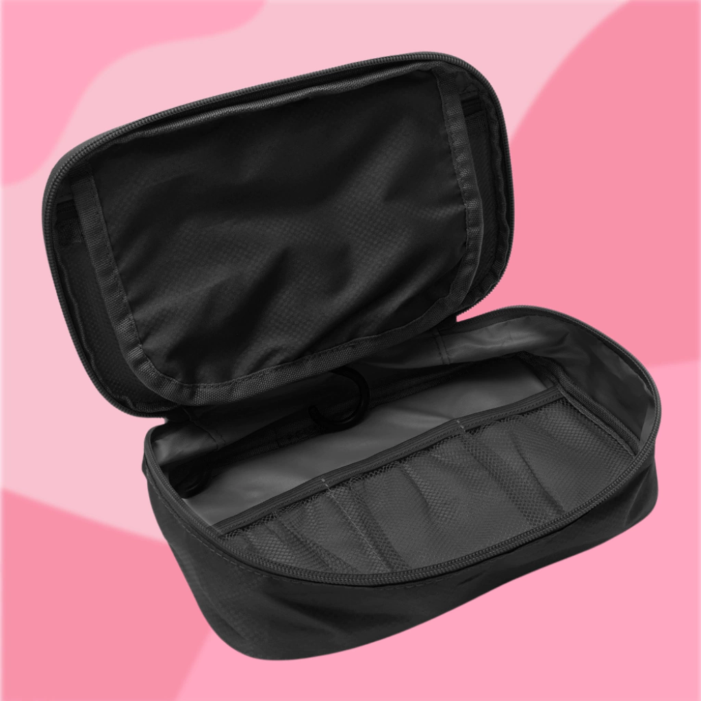Cuenta con 2 cierres internos, 3 compartimentos y práctico gancho para colgar. Ideal para viajes.