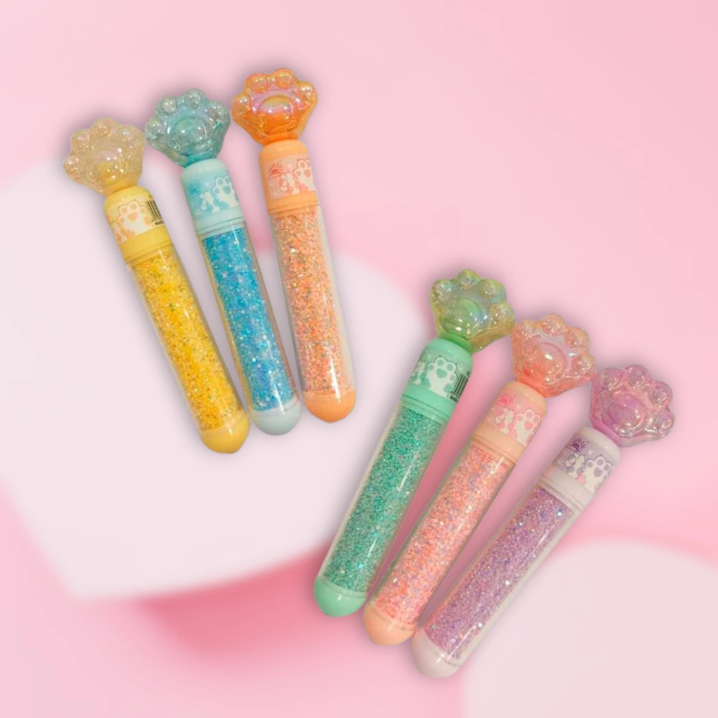 Resaltadores con tapa en forma de huellita y cuerpo relleno de glitter, ideales para darle un toque divertido y brillante a tus apuntes. Su diseño llamativo los convierte en el complemento perfecto para la cartuchera.